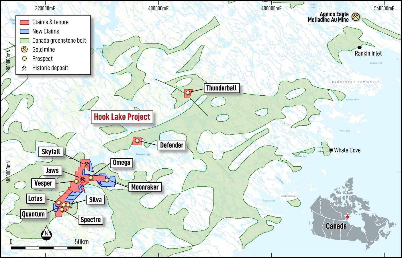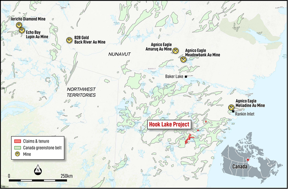 The Hook Lake Project is located in the same underexplored highly prospective Nunavut Archean Greenstone Belt that hosts significant gold mineralization discovered and developed to date, including Agnico Eagle’s 6.7moz Au Meladine Mine (34.3 million tonnes @ 6.12g/t Au¹) (130 to 225 km to the northeast of Hook Lake) and the in-development Back River Gold District, Goose & George Project boasting 9.2 Million Oz Au at 6.04g/t measured, indicated & Inferred with an anticipated 310,000 Ozs Au annual production – B2Gold, 2024².