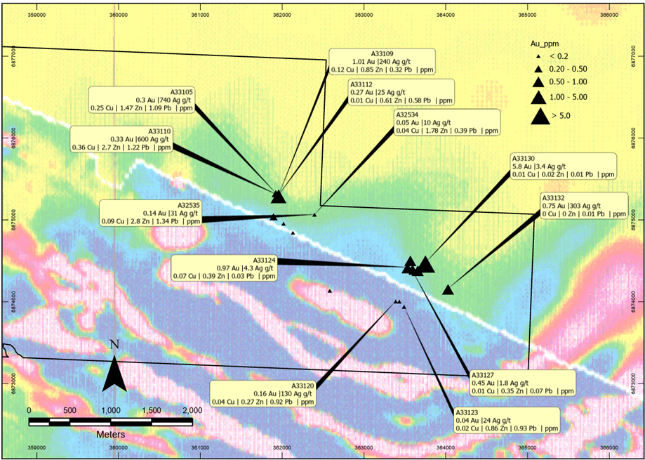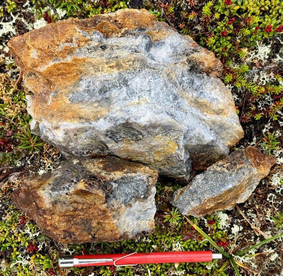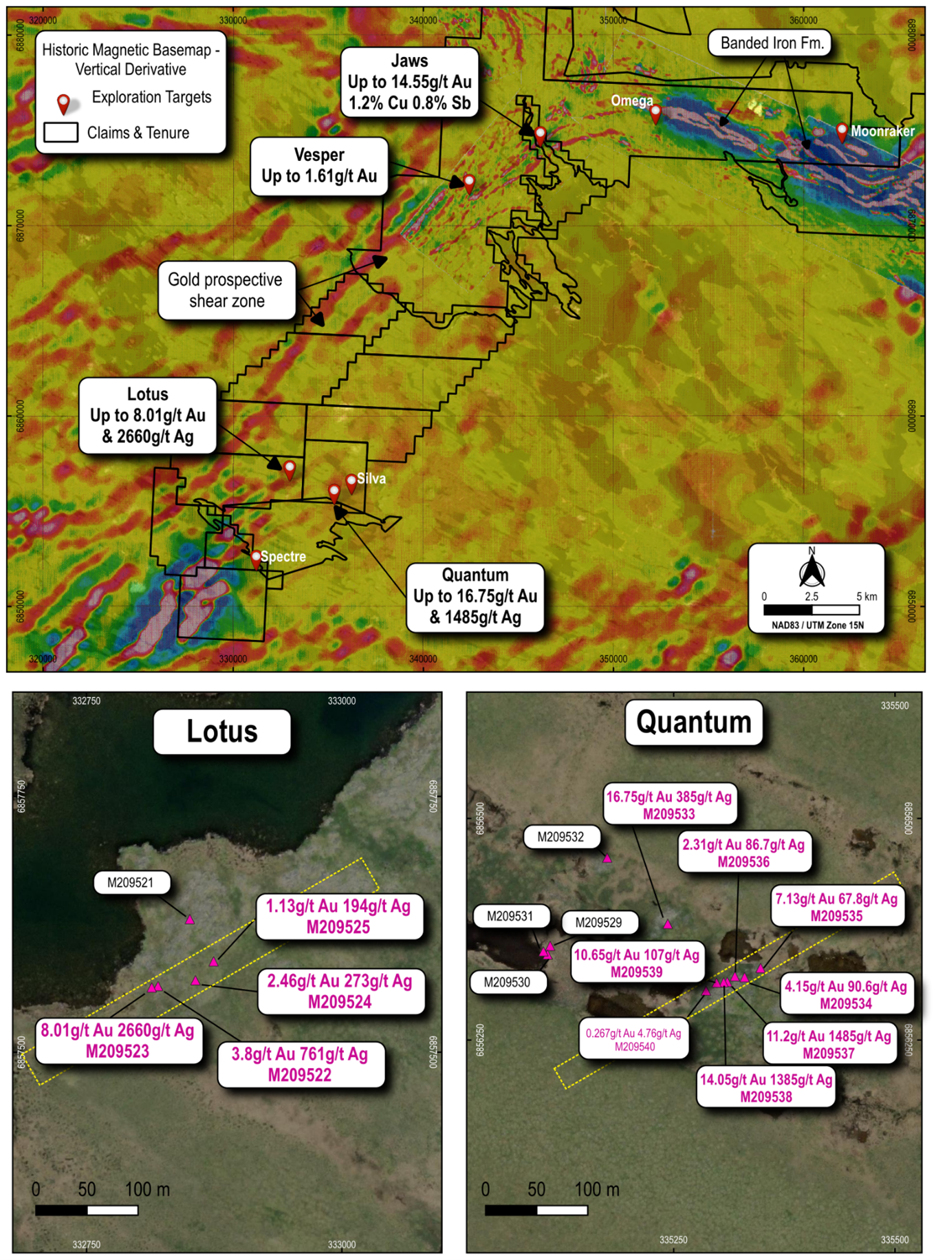 Quantum and Lotus have never been drill tested. They represent further “Jaws-style” orogenic/greenstone gold targets with high-grade gold-silver assay results from the maiden surface sampling programme. Both targets have exposed quartz veins at surface which are conformable to the NE/SW trend of local stratigraphy in the Archean volcanics. The veining is covered at both ends by a veneer of glacial overburden, but they are sampled over strike lengths of 67m (quantum) and 66m (lotus) by maiden sampling efforts. As both vein systems are untested by drilling there is strong upside for discovery potential. The 2025 magnetic survey will assist in drill targeting these well-endowed systems.