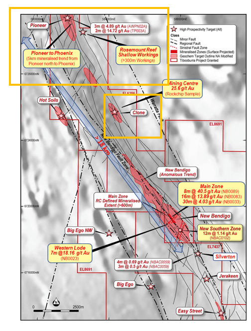 - New Bendigo South – which lies ~ 600m on strike south of the “Main Zone” where scout drilling last year returned 12m at 1.14 g/t from surface (NBAC0103), intersecting a potentially new zone of gold mineralisation that is yet to be followed up